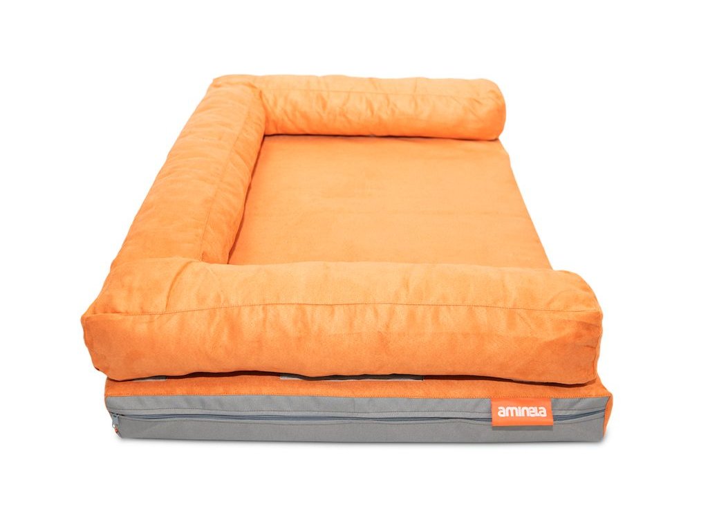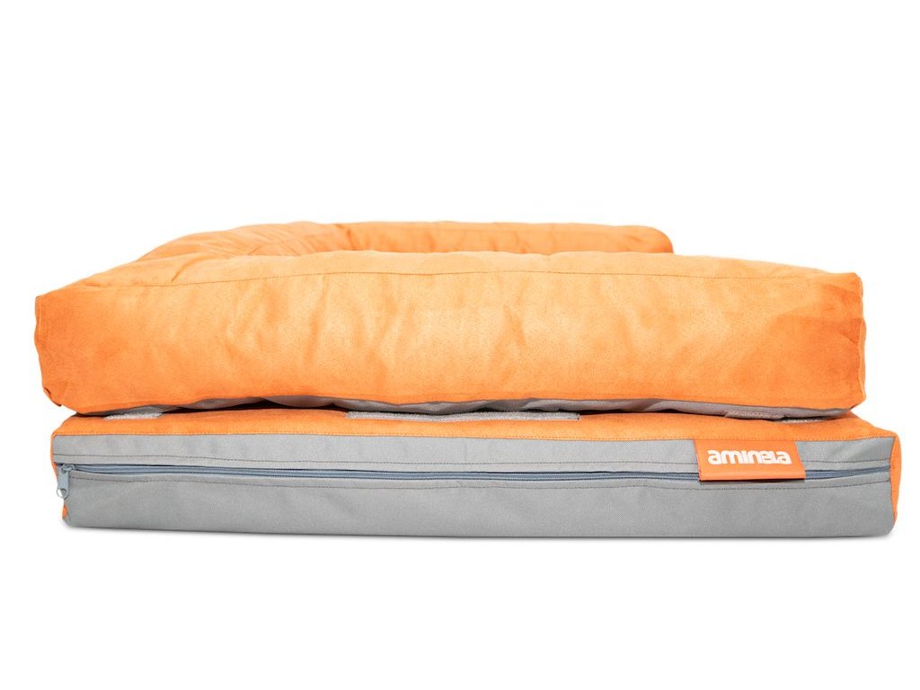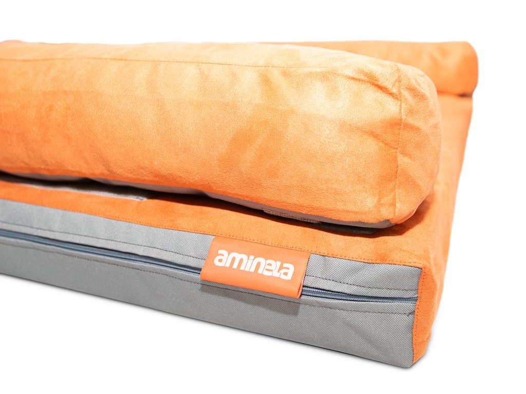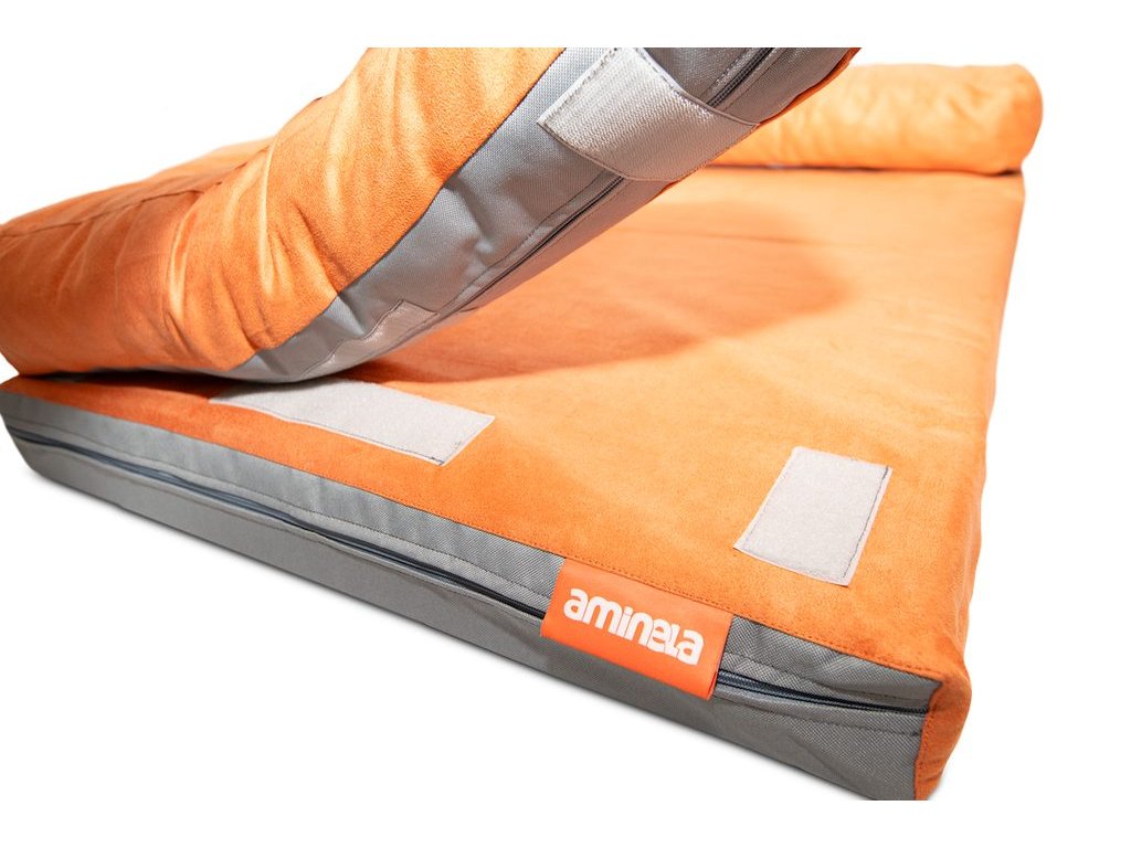 Matrace Aminela se skládá z dvou odolných materiálů, z voděnepropustného materiálu a měkkého, hebkého, avšak pevného a voděodpudivého materiálu, který nešustí a pro psa je velmi pohodlný. Ze stejně hebkého a pohodlného materiálu je vyroben okraj, který se na matraci přichytí pomocí suchých zipů. Kdykoliv se dá okraj odlepit a zase nalepit.