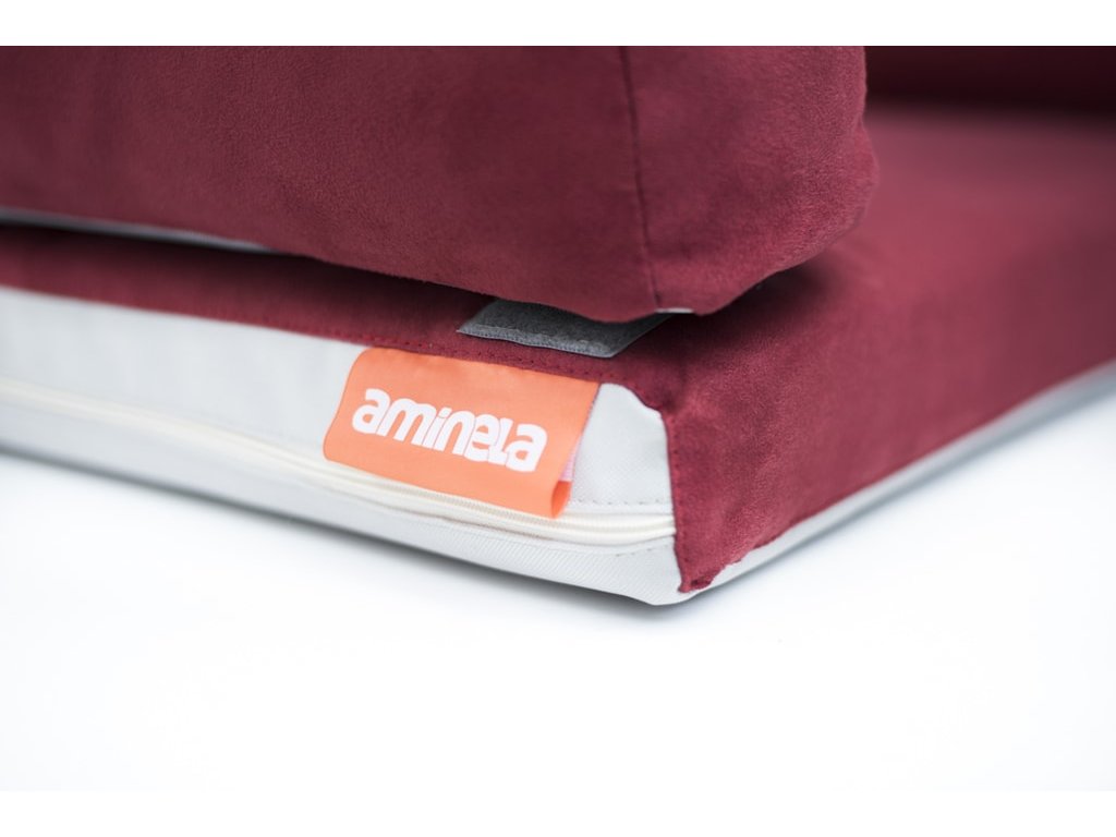 Matrace Aminela se skládá z dvou odolných materiálů, z voděnepropustného materiálu a měkkého, hebkého, avšak pevného a voděodpudivého materiálu, který nešustí a pro psa je velmi pohodlný. Ze stejně hebkého a pohodlného materiálu je vyroben okraj, který se na matraci přichytí pomocí suchých zipů. Kdykoliv se dá okraj odlepit a zase nalepit.