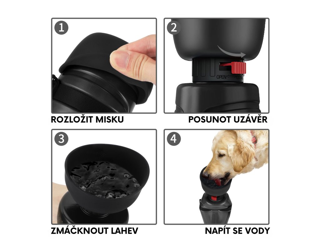 Jak to funguje? Na vrchním uzávěru láhve najdete ohrnovací misku. Stačí jen odjistit ventil, lehce stisknout lahev a voda se okamžitě přepustí do misky. Ventil zavřete a dáte chlupáči napít. A to nejlepší je, že po občerstvení znovu odjistíte ventil a zbylá voda se vrátí zpět do lahve. Vyhnete se tak plýtvání vodou.