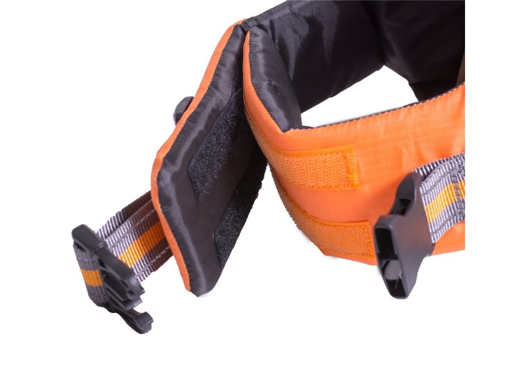 Vesta se pohodlně nasazuje – vepředu se zapíná pomocí suchého zipu a plastové přezky, pod břichem je zajištěna dvěma nastavitelnými popruhy s plastovými přezkami. Díky ergonomickému tvaru neomezuje v pohybu a dobře sedí.