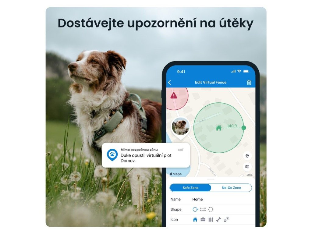 Nastavte Virtuální plot pro GPS pro psy pomocí mapy v aplikaci Tractive. Pokud váš pes opustí bezpečnou zónu, dostanete upozornění na útěk. Označte nebezpečné zóny, abyste věděli, když se vaše štěňátko dostane někam, kam nemá.