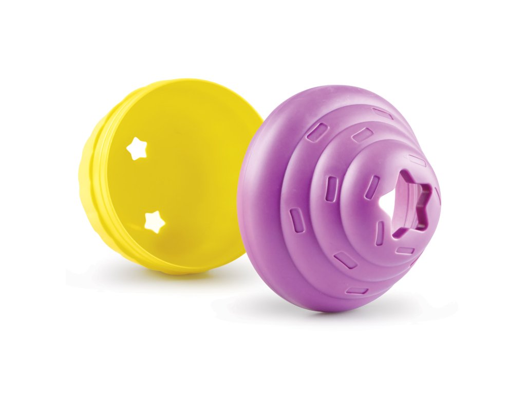 - Hračka je složena ze dvou částí, vrchní část je z tvrdé gumy a spodní miska je z odolného plastu, který vydrží nekonečné hodiny koulení