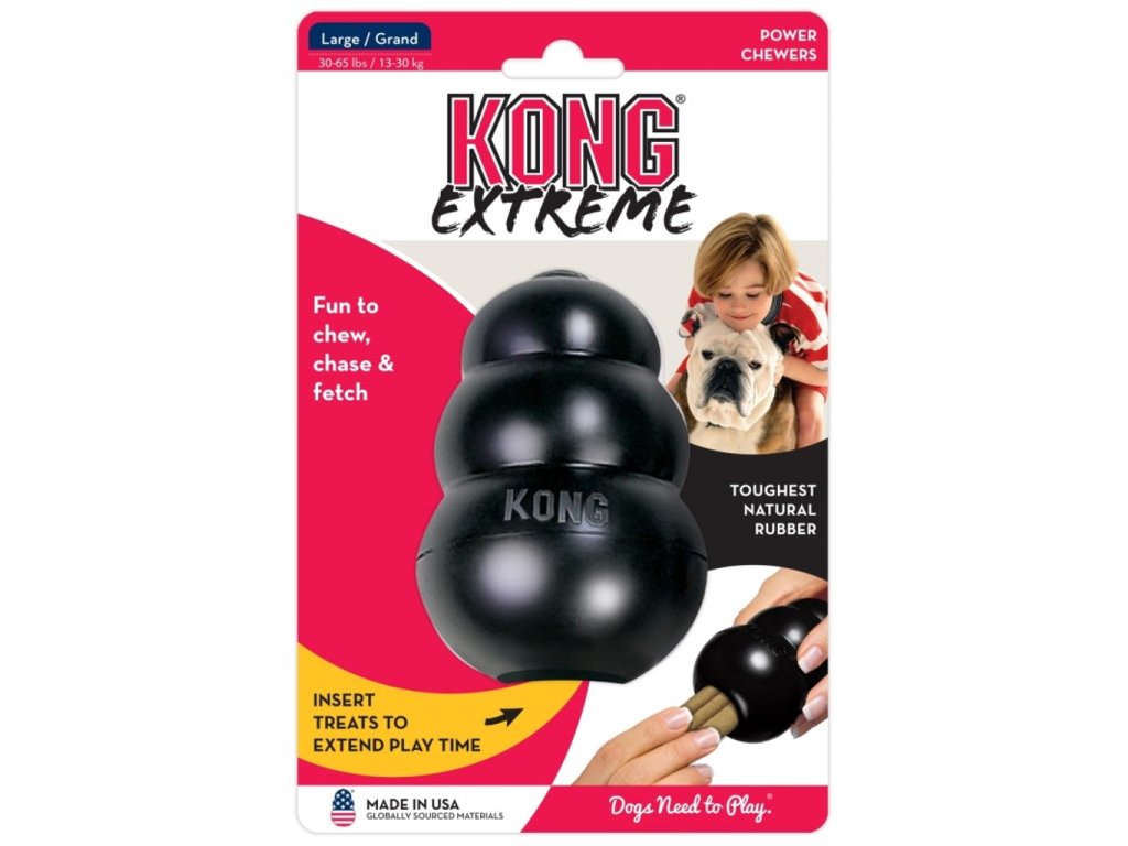 Hračka KONG Extreme je interaktivní plnitelná hračka pro psy ze speciální odolné gumy. Je vyrobena z ultra elastického, čistě přírodního kaučuku, který je velmi pružný a zároveň velmi odolný a pevný i pro největší ničitele hraček. Speciální tvar zajišťuje při dopadu nepravidelný odraz. Hračku lze naplnit pamlsky nebo pastou a zvýšit tak zájem psa o hračku. KONG je účinný výcvikový prostředek, který vyléčí mnohé nežádoucí chování: kousání nábytku, věcí, strach z odloučení, při přivykání na nové prostředí nebo zabránění nudě.