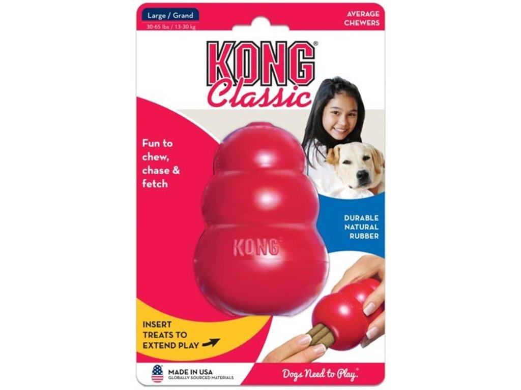 Hračka KONG je interaktivní plnitelná hračka pro psy ze speciální odolné gumy. Je vyrobena z ultra elastického, čistě přírodního kaučuku, který je velmi pružný a zároveň velmi odolný a pevný i pro největší ničitele hraček. Speciální tvar zajišťuje při dopadu nepravidelný odraz. Hračku lze naplnit pamlsky nebo pastou a zvýšit tak zájem psa o hračku. KONG je účinný výcvikový prostředek, který vyléčí mnohé nežádoucí chování: kousání nábytku, věcí, strach z odloučení, při přivykání na nové prostředí nebo zabránění nudě.