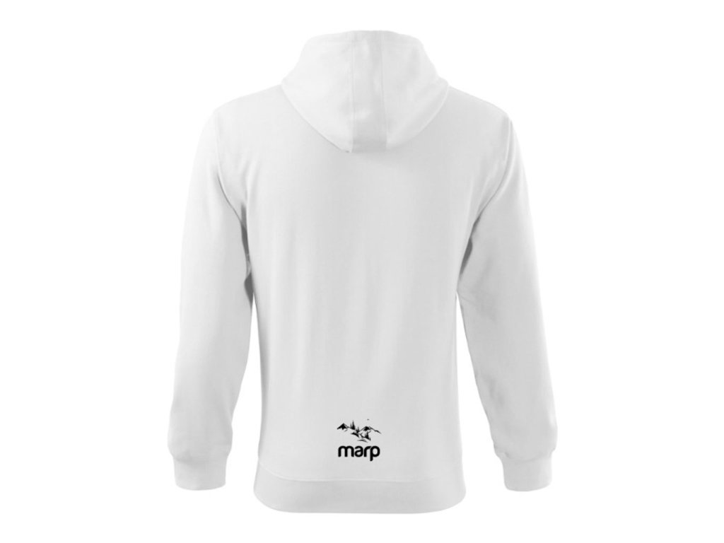 Mikina Marp je navržena pro maximální pohodlí i styl. Pánská mikina je rovného střihu s bočními švy, celo propínacím kostěným zipem a nakládanými kapsami ve stylu klokanky. Kapuce má stahovací šňůrku. Vnitřní část průkrčníku je začištěna kontrastní páskou, spodní lem a manžety rukávů jsou z žebrového úpletu 2:2 s 5 % elastanu