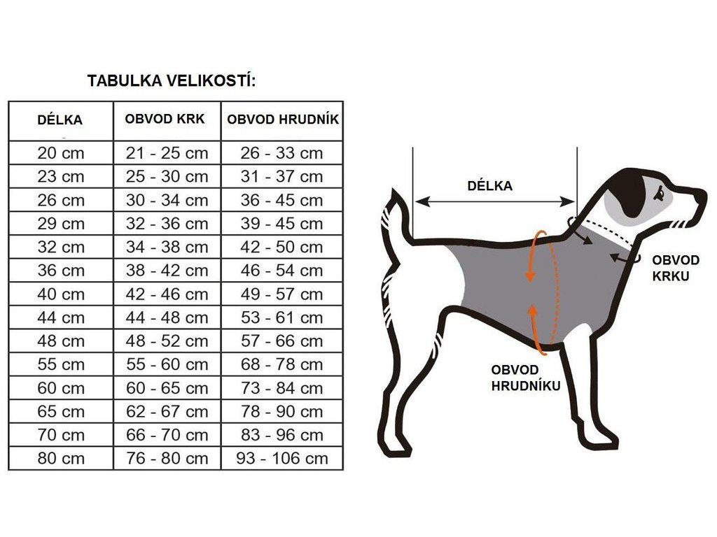 Obleček vybírejte podle délky zad pejska. Změřte pejskovi délku zad (před předními lopatkami po kořen ocasu) a vyberte obleček shodné nebo nejbližší délky (je uvedena v názvu oblečku). Následně přeměřte obvod u krku a kolem hrudníku (nejširší místo za předními tlapkami, viz. obrázek "tabulka velikostí" oranžová šipka).