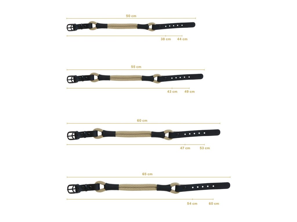 Obojky jsou vyráběny z pevného horolezeckého lana, které zaručuje vysokou odolnost a dlouhou životnost a jsou doplněny o prvky z pravé kůže, které dodávají obojku elegantní vzhled.