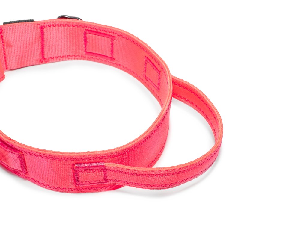 strategicky umístěné madlo pro okamžitou kontrolu nad psem; neocenitelné při přecházení silnice, v blízkosti cyklistů nebo při setkání s jinými psy; ergonomicky tvarované pro pohodlný úchop i v náročných situacích; diskrétně zapracované do designu obojku, takže nepřekáží při běžném používání